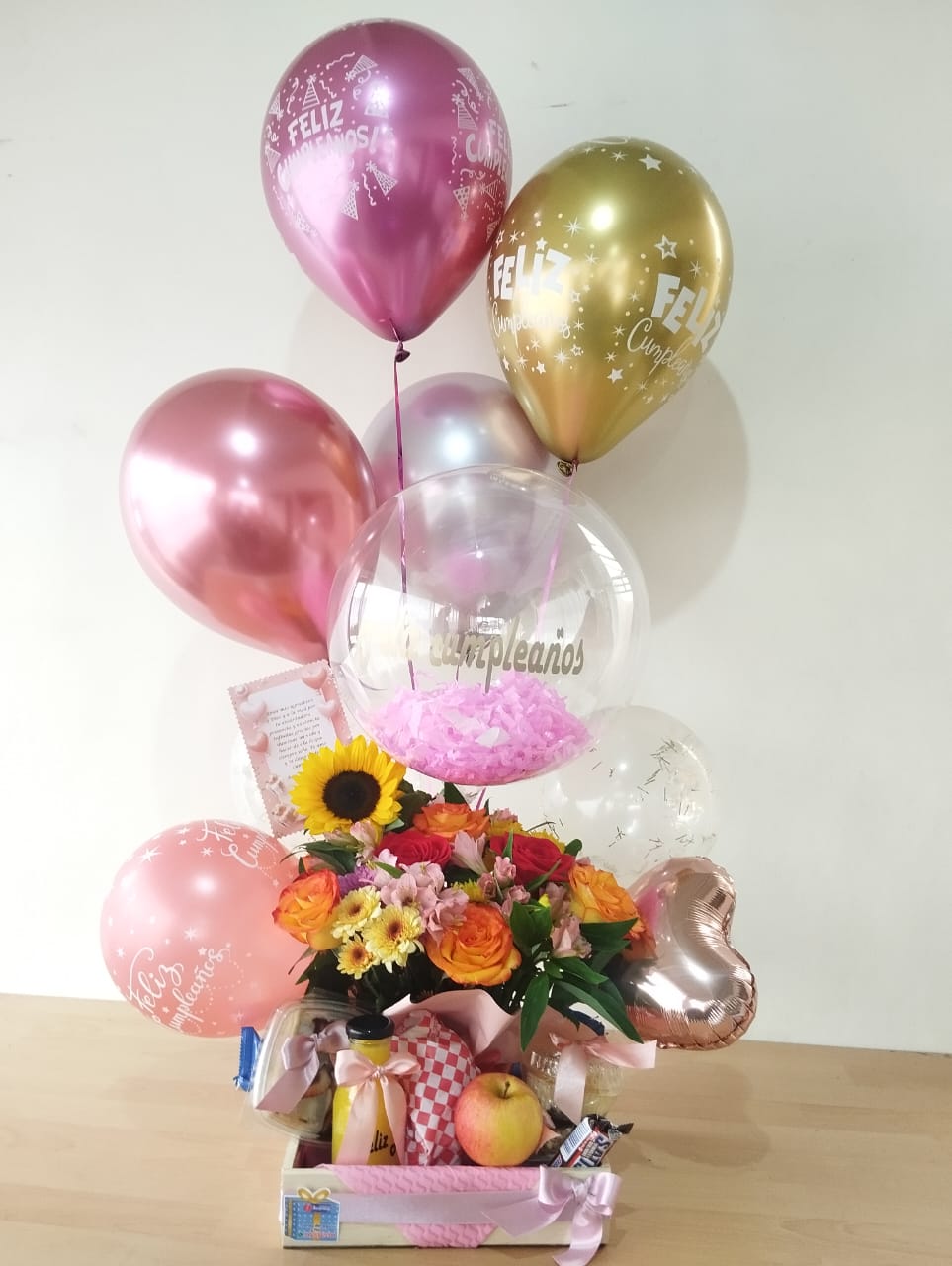 - Todo presentado en una elegante caja de madera con decoración de globos en helio y tarjeta personalizada para un regalo inolvidable.